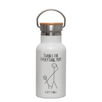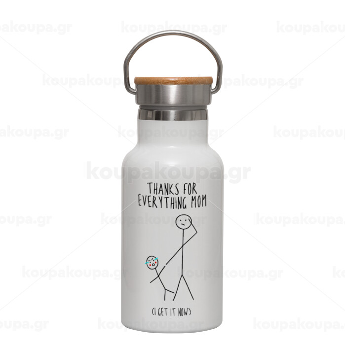 Thanks for everything mom, Μεταλλικό παγούρι θερμός (Stainless steel) Λευκό με ξύλινο καπακι (bamboo), διπλού τοιχώματος, 350ml