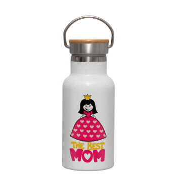 The Best Mom Queen, Μεταλλικό παγούρι θερμός (Stainless steel) Λευκό με ξύλινο καπακι (bamboo), διπλού τοιχώματος, 350ml