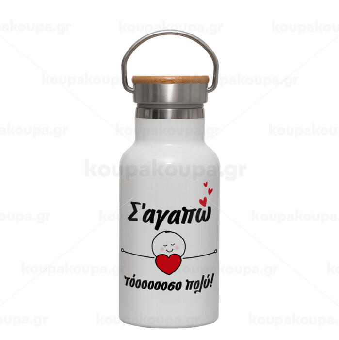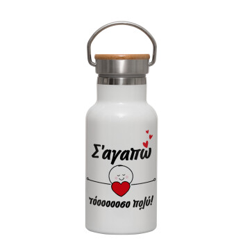 Σ΄αγαπώ τόοοοσο πολύ (Κορίτσι)!!!, Μεταλλικό παγούρι θερμός (Stainless steel) Λευκό με ξύλινο καπακι (bamboo), διπλού τοιχώματος, 350ml