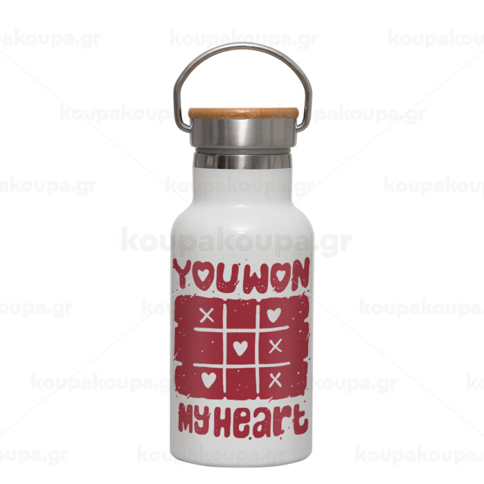 Τρίλιζα you won my heart, Μεταλλικό παγούρι θερμός (Stainless steel) Λευκό με ξύλινο καπακι (bamboo), διπλού τοιχώματος, 350ml