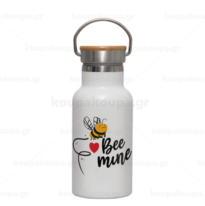 Bee mine!!!, Μεταλλικό παγούρι θερμός (Stainless steel) Λευκό με ξύλινο καπακι (bamboo), διπλού τοιχώματος, 350ml