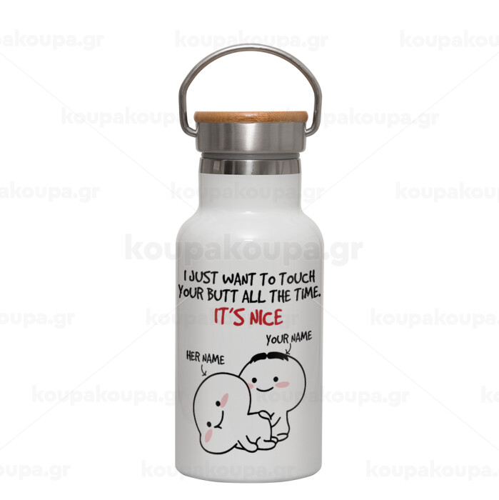 I Just Want To Touch Your Butt All The Time, Μεταλλικό παγούρι θερμός (Stainless steel) Λευκό με ξύλινο καπακι (bamboo), διπλού τοιχώματος, 350ml