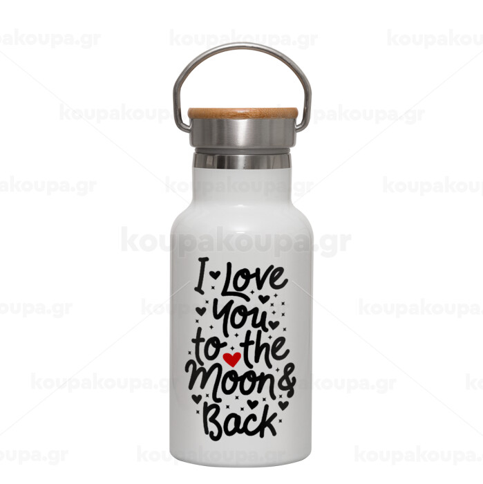 I love you to the moon and back with hearts, Μεταλλικό παγούρι θερμός (Stainless steel) Λευκό με ξύλινο καπακι (bamboo), διπλού τοιχώματος, 350ml