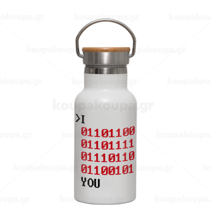 I .... YOU, binary secret MSG, Μεταλλικό παγούρι θερμός (Stainless steel) Λευκό με ξύλινο καπακι (bamboo), διπλού τοιχώματος, 350ml