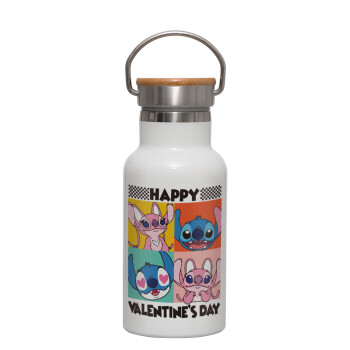 Lilo & Stitch Happy valentines day, Μεταλλικό παγούρι θερμός (Stainless steel) Λευκό με ξύλινο καπακι (bamboo), διπλού τοιχώματος, 350ml
