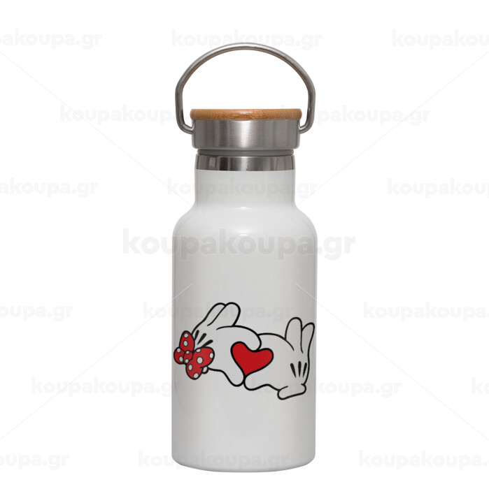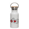 Love hands, Μεταλλικό παγούρι θερμός (Stainless steel) Λευκό με ξύλινο καπακι (bamboo), διπλού τοιχώματος, 350ml