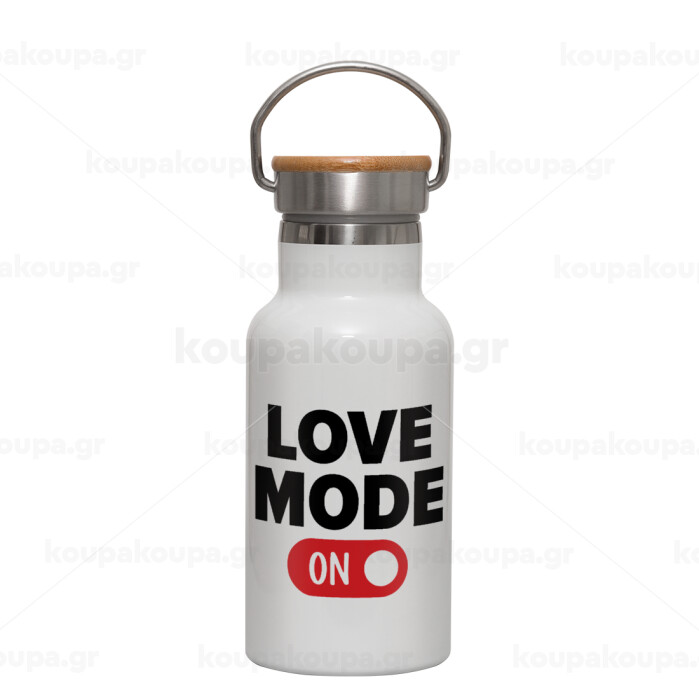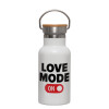 LOVE MODE ON, Μεταλλικό παγούρι θερμός (Stainless steel) Λευκό με ξύλινο καπακι (bamboo), διπλού τοιχώματος, 350ml