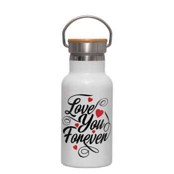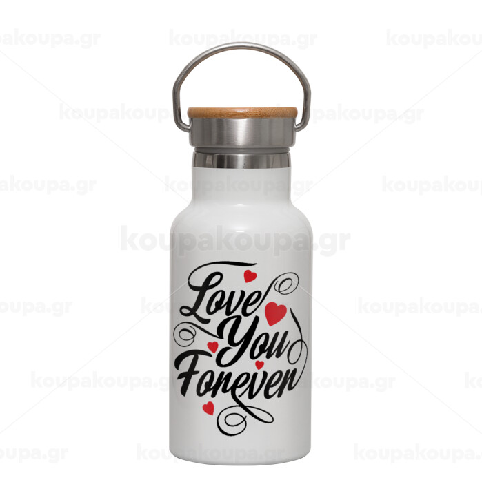 Love you forever, Μεταλλικό παγούρι θερμός (Stainless steel) Λευκό με ξύλινο καπακι (bamboo), διπλού τοιχώματος, 350ml