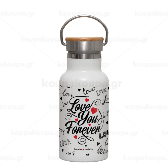Love You Forever, Μεταλλικό παγούρι θερμός (Stainless steel) Λευκό με ξύλινο καπακι (bamboo), διπλού τοιχώματος, 350ml
