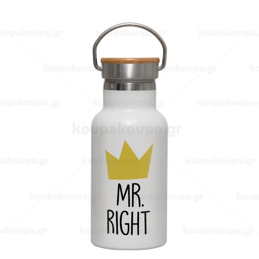 Mr right, Μεταλλικό παγούρι θερμός (Stainless steel) Λευκό με ξύλινο καπακι (bamboo), διπλού τοιχώματος, 350ml