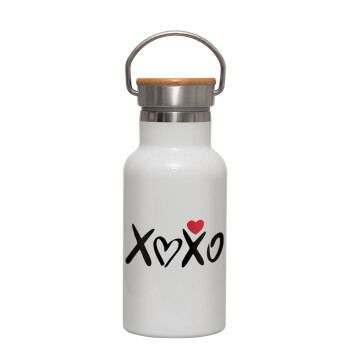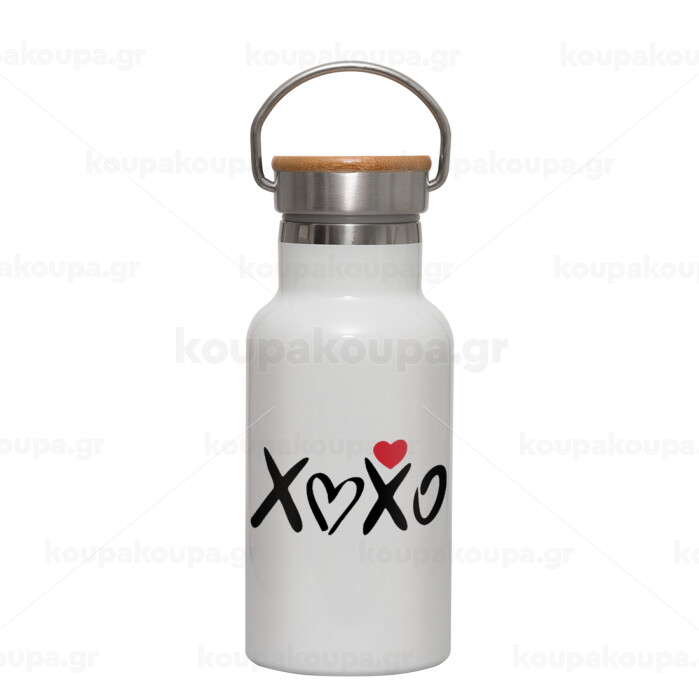 xoxo, Μεταλλικό παγούρι θερμός (Stainless steel) Λευκό με ξύλινο καπακι (bamboo), διπλού τοιχώματος, 350ml