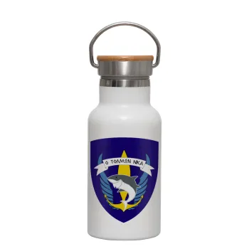 Ο τολμών νικά, καρχαρίας, Μεταλλικό παγούρι θερμός (Stainless steel) Λευκό με ξύλινο καπακι (bamboo), διπλού τοιχώματος, 350ml