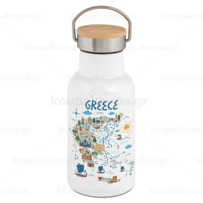 Χάρτης Ελλάδος, Μεταλλικό παγούρι θερμός (Stainless steel) Λευκό με ξύλινο καπακι (bamboo), διπλού τοιχώματος, 350ml