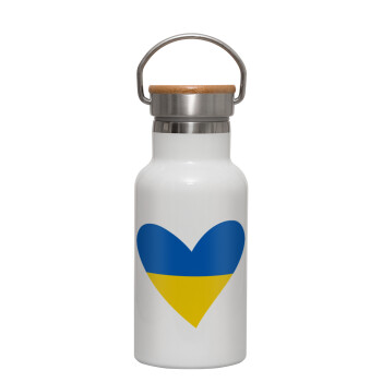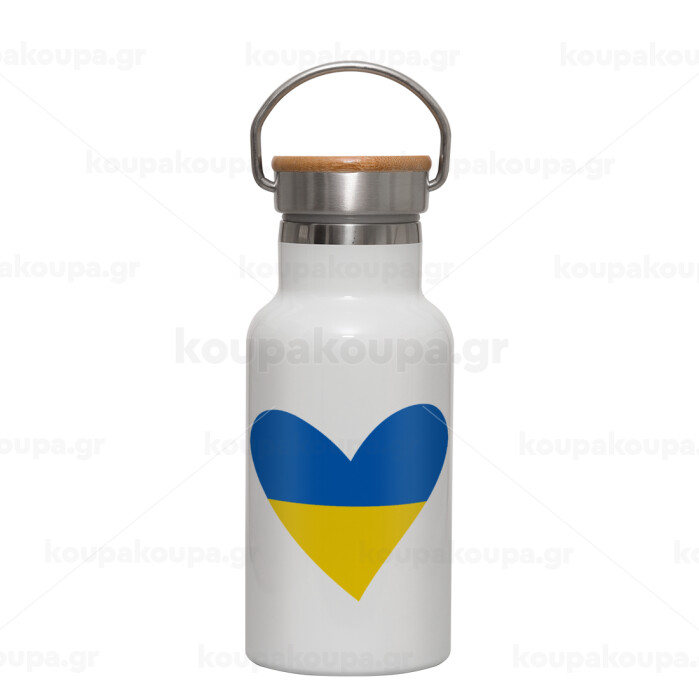 UKRAINE heart, Μεταλλικό παγούρι θερμός (Stainless steel) Λευκό με ξύλινο καπακι (bamboo), διπλού τοιχώματος, 350ml