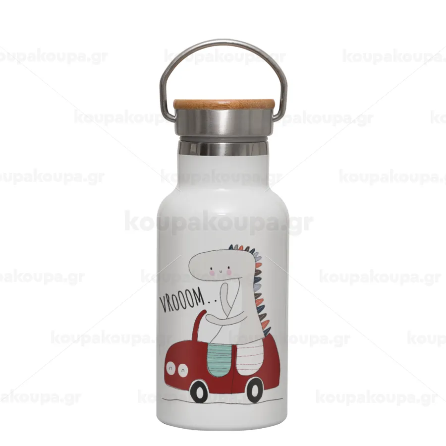 Βρουμ βρουμ, Μεταλλικό παγούρι θερμός (Stainless steel) Λευκό με ξύλινο καπακι (bamboo), διπλού τοιχώματος, 350ml