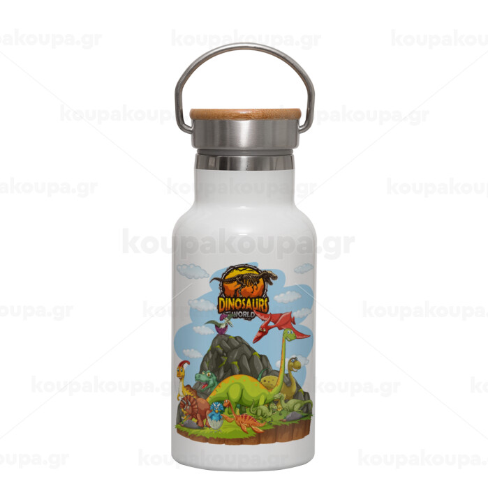 Dinosaur's world, Μεταλλικό παγούρι θερμός (Stainless steel) Λευκό με ξύλινο καπακι (bamboo), διπλού τοιχώματος, 350ml