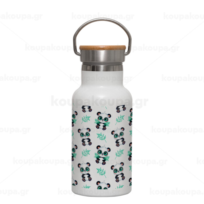 Panda, Μεταλλικό παγούρι θερμός (Stainless steel) Λευκό με ξύλινο καπακι (bamboo), διπλού τοιχώματος, 350ml
