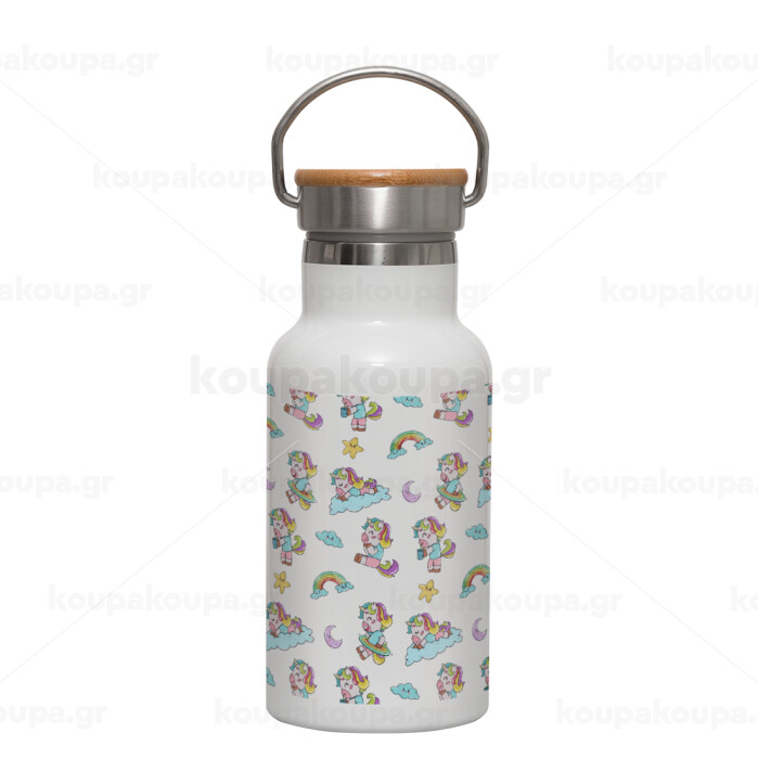 Unicorn pattern, Μεταλλικό παγούρι θερμός (Stainless steel) Λευκό με ξύλινο καπακι (bamboo), διπλού τοιχώματος, 350ml
