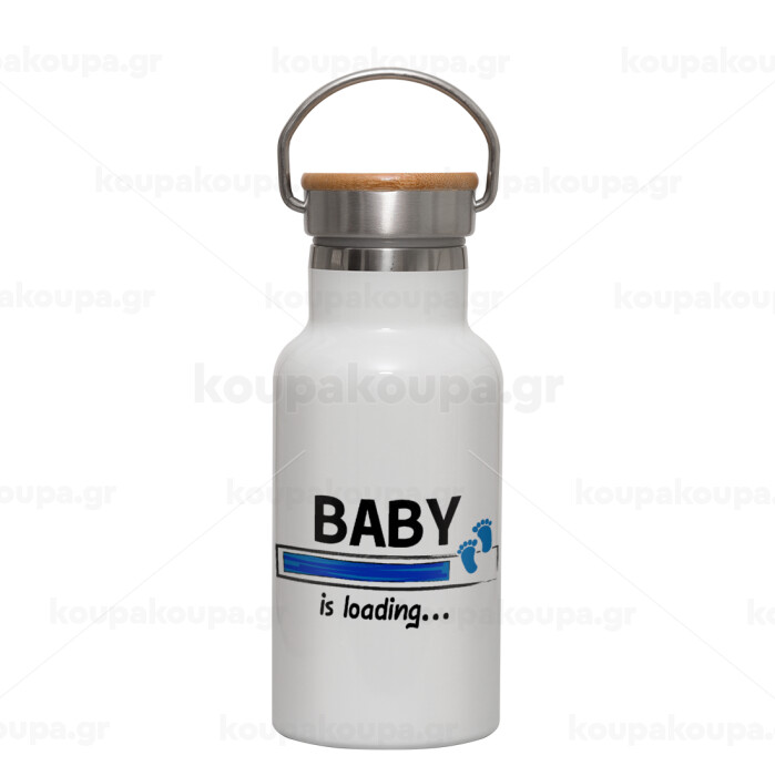 Baby is Loading BOY, Μεταλλικό παγούρι θερμός (Stainless steel) Λευκό με ξύλινο καπακι (bamboo), διπλού τοιχώματος, 350ml