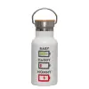 BABY, MOMMY, DADDY Low battery, Μεταλλικό παγούρι θερμός (Stainless steel) Λευκό με ξύλινο καπακι (bamboo), διπλού τοιχώματος, 350ml