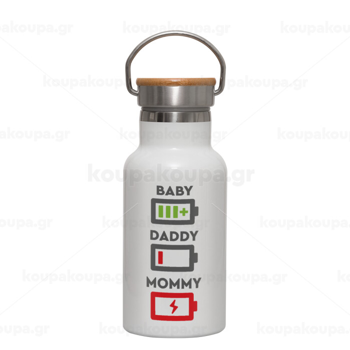 BABY, MOMMY, DADDY Low battery, Μεταλλικό παγούρι θερμός (Stainless steel) Λευκό με ξύλινο καπακι (bamboo), διπλού τοιχώματος, 350ml