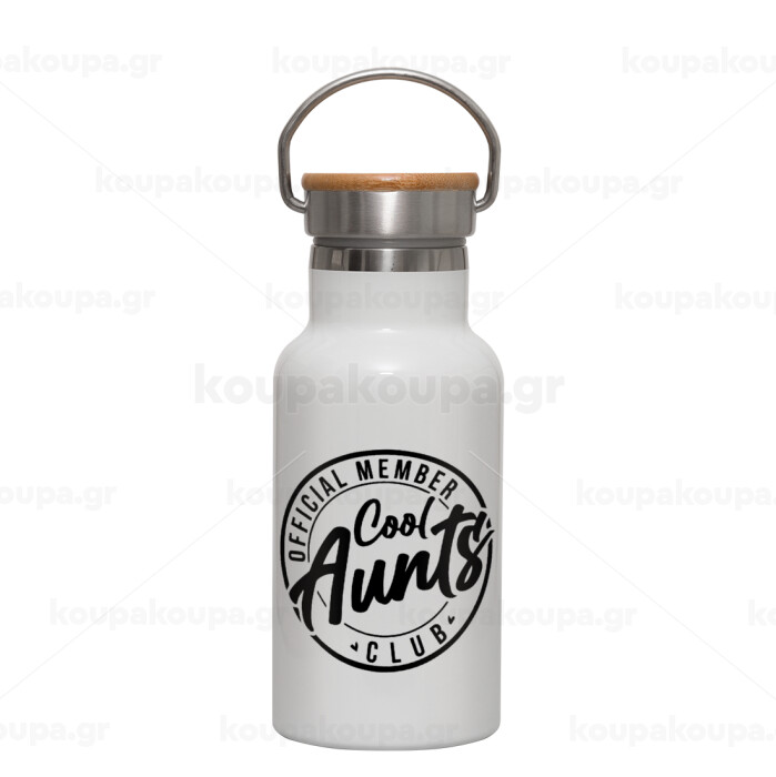Cool Aunts club, Μεταλλικό παγούρι θερμός (Stainless steel) Λευκό με ξύλινο καπακι (bamboo), διπλού τοιχώματος, 350ml