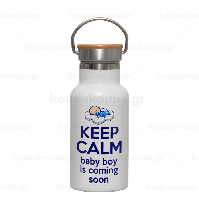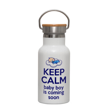 KEEP CALM baby boy is coming soon!!!, Μεταλλικό παγούρι θερμός (Stainless steel) Λευκό με ξύλινο καπακι (bamboo), διπλού τοιχώματος, 350ml