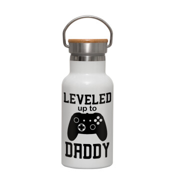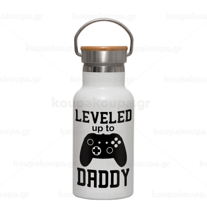 Leveled to Daddy, Μεταλλικό παγούρι θερμός (Stainless steel) Λευκό με ξύλινο καπακι (bamboo), διπλού τοιχώματος, 350ml