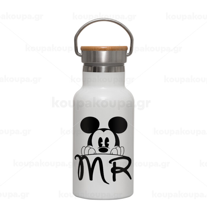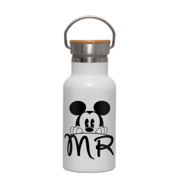 Mikey Mr, Μεταλλικό παγούρι θερμός (Stainless steel) Λευκό με ξύλινο καπακι (bamboo), διπλού τοιχώματος, 350ml