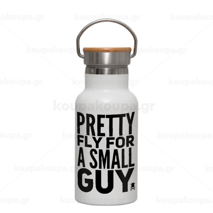 Pretty fly for a small guy, Μεταλλικό παγούρι θερμός (Stainless steel) Λευκό με ξύλινο καπακι (bamboo), διπλού τοιχώματος, 350ml