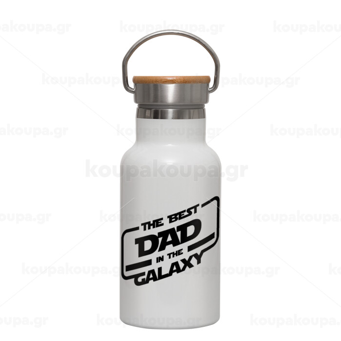 The Best DAD in the Galaxy, Μεταλλικό παγούρι θερμός (Stainless steel) Λευκό με ξύλινο καπακι (bamboo), διπλού τοιχώματος, 350ml