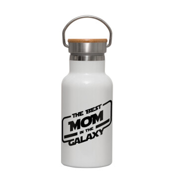 The Best MOM in the Galaxy, Μεταλλικό παγούρι θερμός (Stainless steel) Λευκό με ξύλινο καπακι (bamboo), διπλού τοιχώματος, 350ml