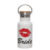 Bride kiss, Μεταλλικό παγούρι θερμός (Stainless steel) Λευκό με ξύλινο καπακι (bamboo), διπλού τοιχώματος, 350ml