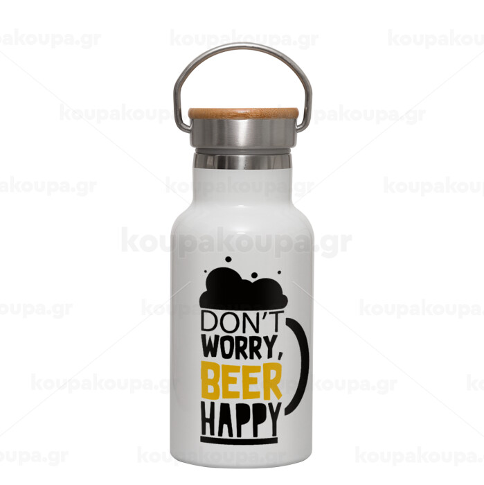Don't worry BEER Happy, Μεταλλικό παγούρι θερμός (Stainless steel) Λευκό με ξύλινο καπακι (bamboo), διπλού τοιχώματος, 350ml