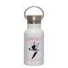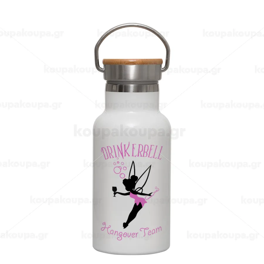 Drinkerbell bachellor, Μεταλλικό παγούρι θερμός (Stainless steel) Λευκό με ξύλινο καπακι (bamboo), διπλού τοιχώματος, 350ml
