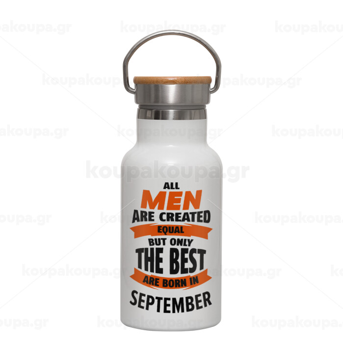 All men are created equal but only the best are born in September, Μεταλλικό παγούρι θερμός (Stainless steel) Λευκό με ξύλινο καπακι (bamboo), διπλού τοιχώματος, 350ml