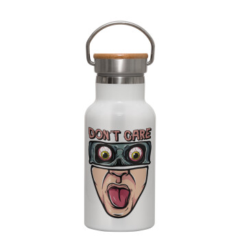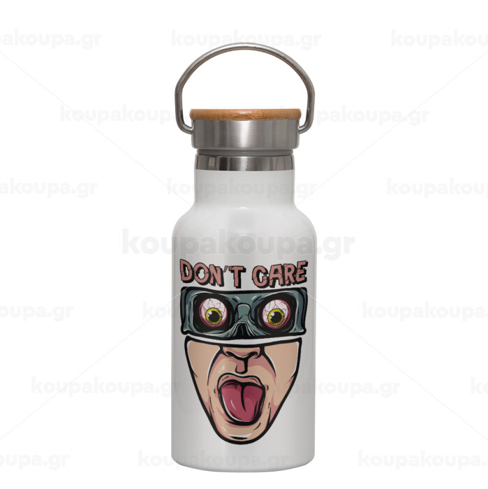 Don't Care, Μεταλλικό παγούρι θερμός (Stainless steel) Λευκό με ξύλινο καπακι (bamboo), διπλού τοιχώματος, 350ml