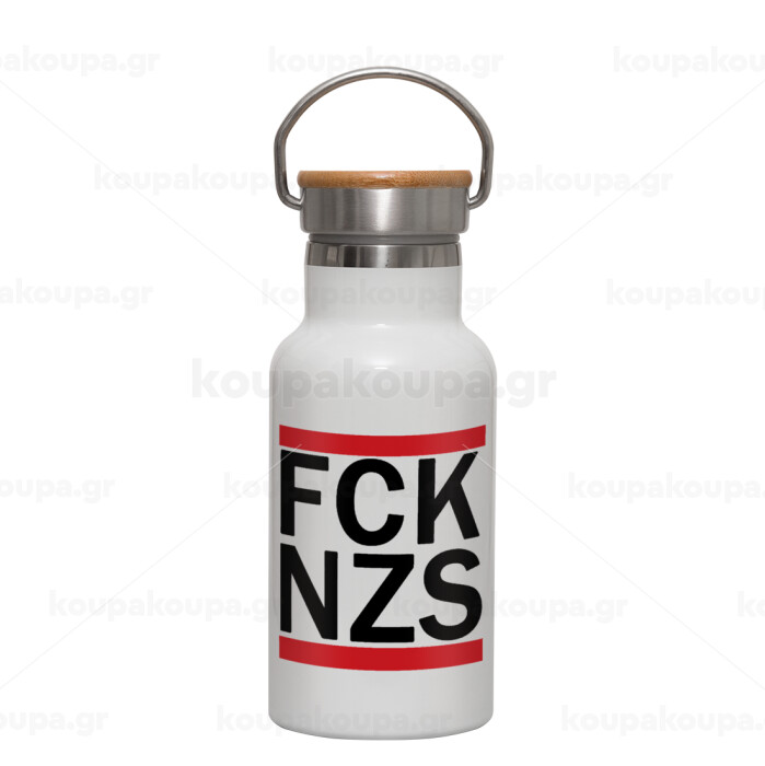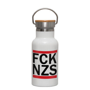 FCK NZS, Μεταλλικό παγούρι θερμός (Stainless steel) Λευκό με ξύλινο καπακι (bamboo), διπλού τοιχώματος, 350ml