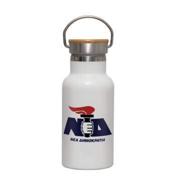 Νέα δημοκρατία κλασική, Μεταλλικό παγούρι θερμός (Stainless steel) Λευκό με ξύλινο καπακι (bamboo), διπλού τοιχώματος, 350ml