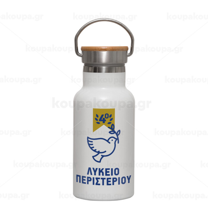 Έμβλημα Σχολικό μπλε/χρυσό περιστέρι, Μεταλλικό παγούρι θερμός (Stainless steel) Λευκό με ξύλινο καπακι (bamboo), διπλού τοιχώματος, 350ml