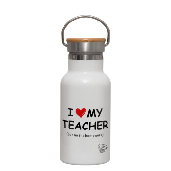 i love my teacher but no the homework, Μεταλλικό παγούρι θερμός (Stainless steel) Λευκό με ξύλινο καπακι (bamboo), διπλού τοιχώματος, 350ml
