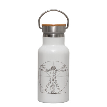 Leonardo da vinci Vitruvian Man, Μεταλλικό παγούρι θερμός (Stainless steel) Λευκό με ξύλινο καπακι (bamboo), διπλού τοιχώματος, 350ml