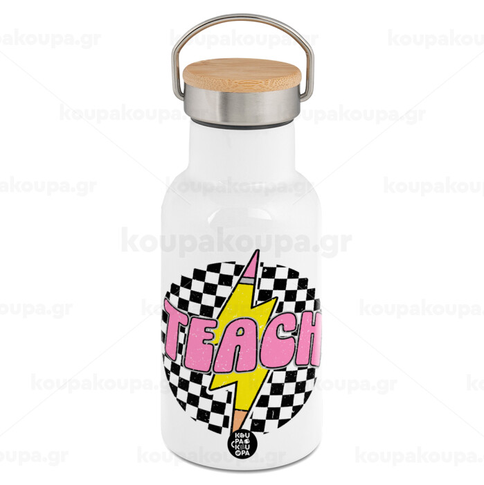 Teach, Μεταλλικό παγούρι θερμός (Stainless steel) Λευκό με ξύλινο καπακι (bamboo), διπλού τοιχώματος, 350ml