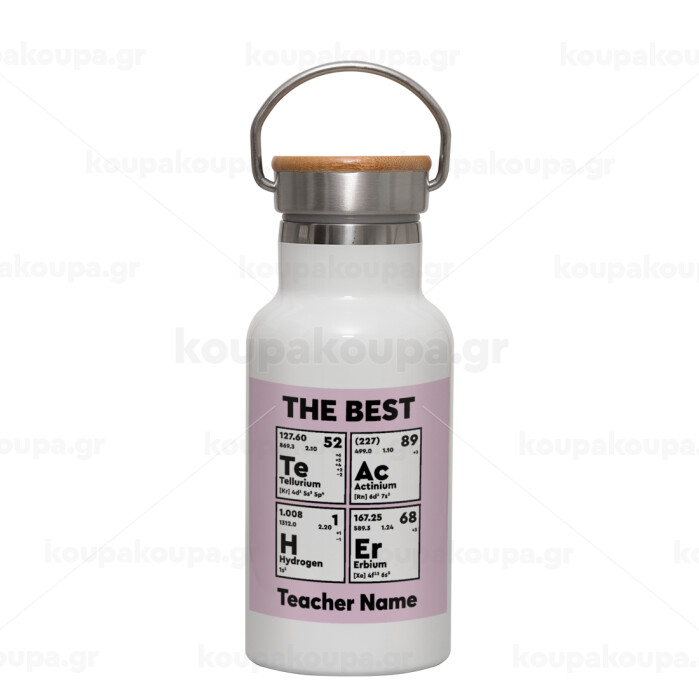 THE BEST Teacher chemical symbols, Μεταλλικό παγούρι θερμός (Stainless steel) Λευκό με ξύλινο καπακι (bamboo), διπλού τοιχώματος, 350ml