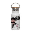 Κρητικός "Έρχεται Πάσχα κουράδι", Μεταλλικό παγούρι θερμός (Stainless steel) Λευκό με ξύλινο καπακι (bamboo), διπλού τοιχώματος, 350ml
