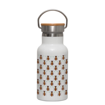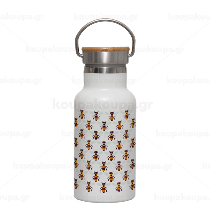 Μελισσούλες, Μεταλλικό παγούρι θερμός (Stainless steel) Λευκό με ξύλινο καπακι (bamboo), διπλού τοιχώματος, 350ml