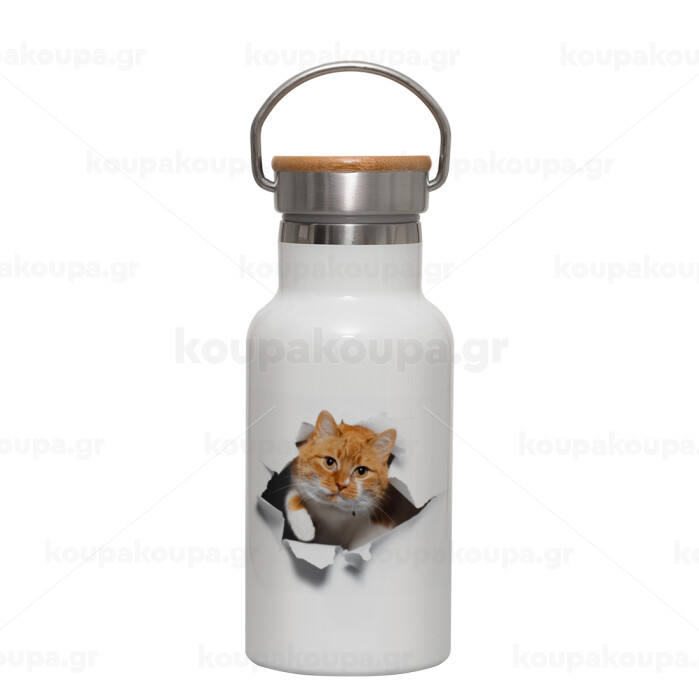 Cat cracked, Μεταλλικό παγούρι θερμός (Stainless steel) Λευκό με ξύλινο καπακι (bamboo), διπλού τοιχώματος, 350ml