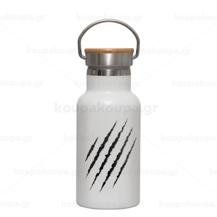 Claw scratch, Μεταλλικό παγούρι θερμός (Stainless steel) Λευκό με ξύλινο καπακι (bamboo), διπλού τοιχώματος, 350ml