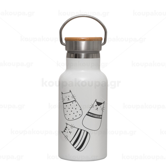 Cute cats, Μεταλλικό παγούρι θερμός (Stainless steel) Λευκό με ξύλινο καπακι (bamboo), διπλού τοιχώματος, 350ml