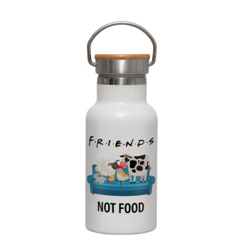 friends, not food, Μεταλλικό παγούρι θερμός (Stainless steel) Λευκό με ξύλινο καπακι (bamboo), διπλού τοιχώματος, 350ml